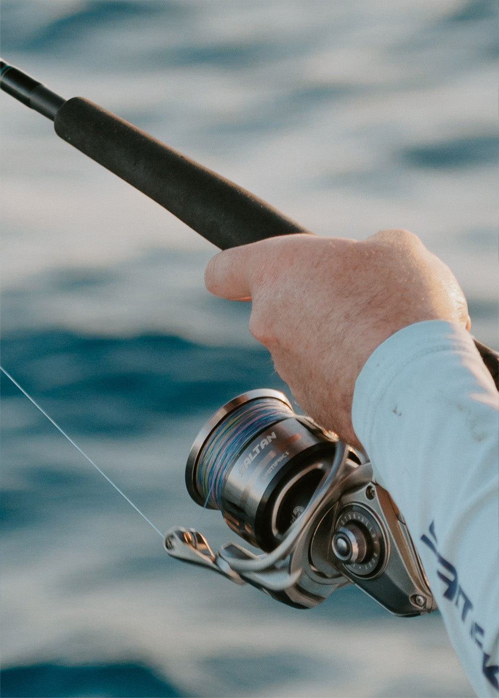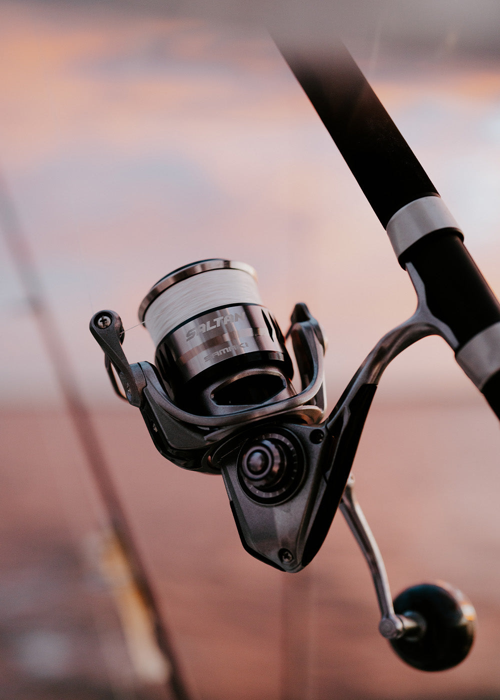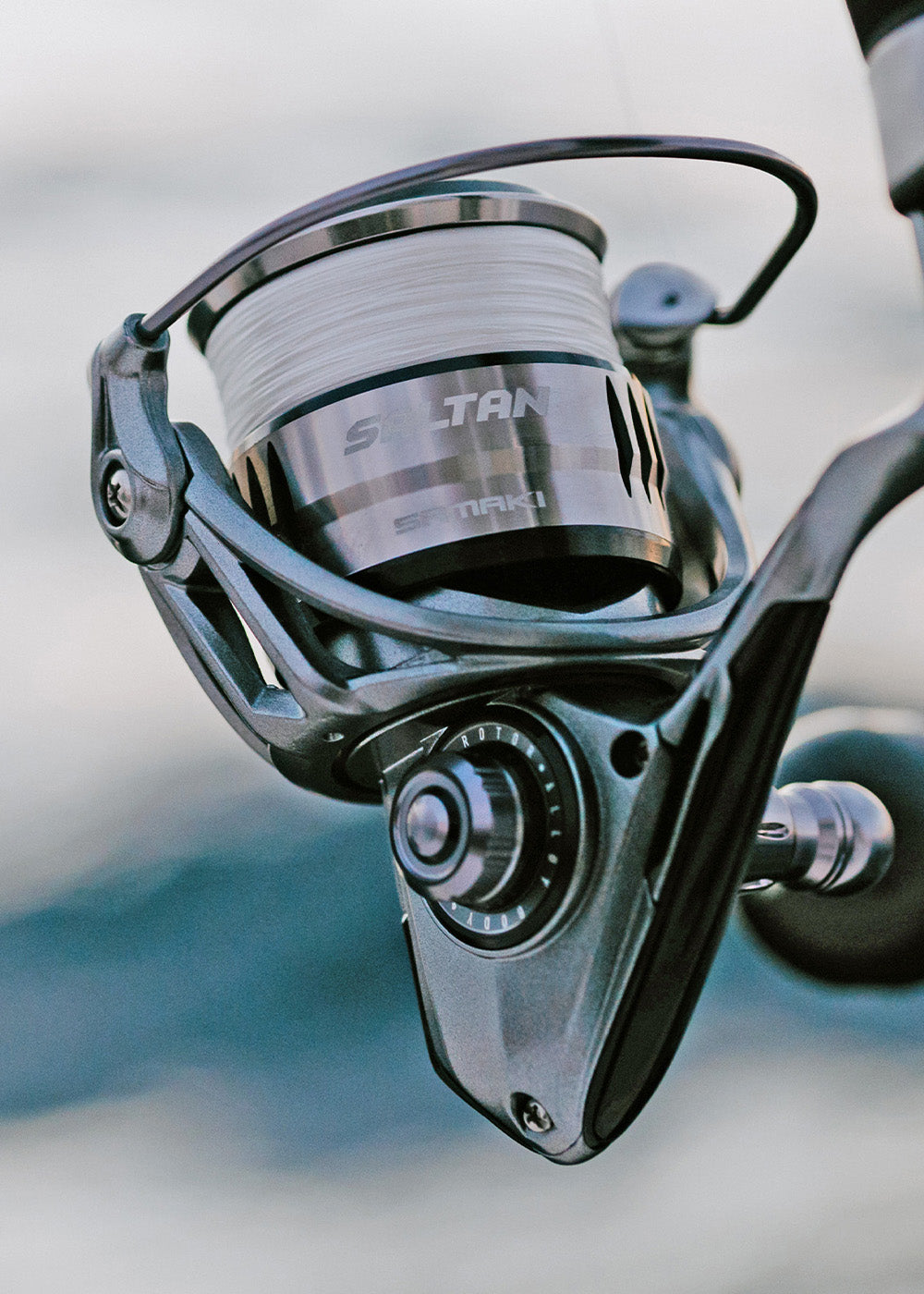 Encased in a MetalBody, these internal systems are protected by a rigid shell that resists flex and twist under heavy loads. The lightweight CarbonCore Rotor reduces rotational mass for faster start-up and effortless retrieves, while the DirectDrive Handle connects straight into the main gear for immediate, solid cranking power. Finished with an oversized PowerGrip Handle Knob for control and comfort, the Saltan delivers the perfect balance of strength, precision, and refinement.
